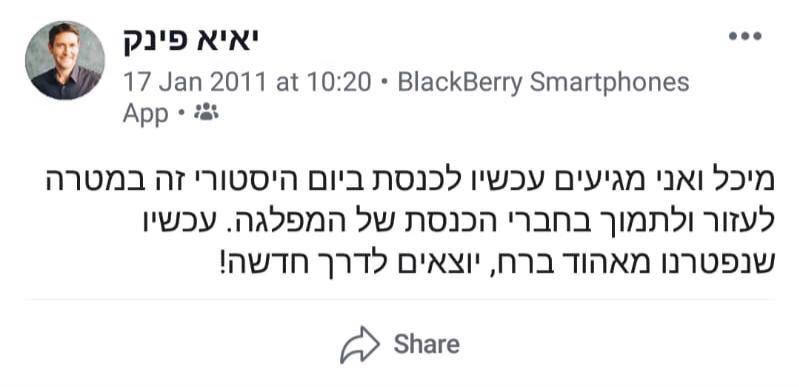 "היום לפני 8 שנים עזב אהוד ברק את מפלגת העבודה. העלו אותי לשידור אצל ירון דקל ב'הכל דיבורים' והוא שאל אותי האם זה המסמר האחרון בארון שלנו." צייץ יאיא פינק לפני כחצי שנה, במהלך קמפיין הבחירות של מפלגת העבודה.
