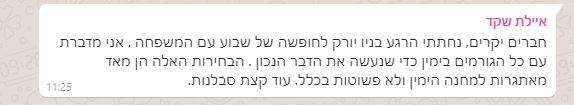 בהודעה לפעיליה בקבות הווטסאפ 'סיירת שקד', כתבה קודם לכן: "חברים יקרים, נחתתי הרגע בניו יורק לחופשה של שבוע עם המשפחה", וציינה כי היא "מדברת עם כל הגורמים בימין כדי שנעשה את הדבר הנכון", לאור ההחלטה שהיא צריכה לקבל באיזו מסגרת תרוץ בבחירות הקרובות.