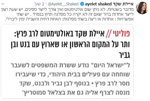 שרת המשפטים לשעבר איילת שקד, שעיני כל מחנה הימין נשואות אליה לקראת החלטתה בימים הקרובים באיזו מסגרת פוליטית להתמודד, דוחה את הדיווח בעיתון 'ישראל היום', לפיו היא הציבה לרב רפי פרץ אולטימטום שאם הוא לא יפנה לה את המקום הראשון במפלגה המאוחדת היא תרוץ עם נפתלי בנט ואיתמר בן גביר.