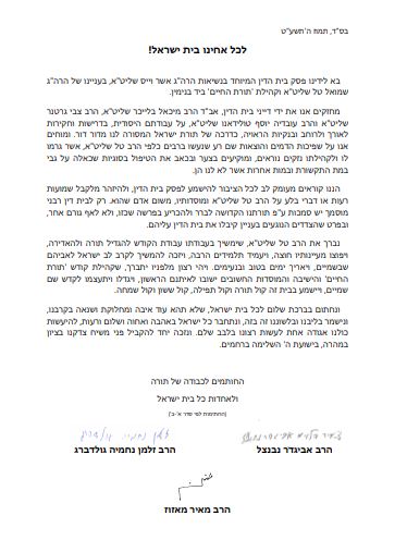 אחרי המכתב של הרב חיים דרוקמן והרב דב ליאור בו הם מותחים בקורת על החלטת בית הדין שדן בפרשת הרב שמואל טל לפיה הוא יכול להמשיך בתפקידו כראש ישיבת 'תורת החיים', כעת, במכתב שהגיע לידי סרוגים, מוחים הרב מאיר מאזוז, הרב אביגדור נבנצל, והרב זלמן נחמיה גולדברג, על הוצאת השם הרב על הרב טל ו"שפיכות הדמים" כדבריהם.