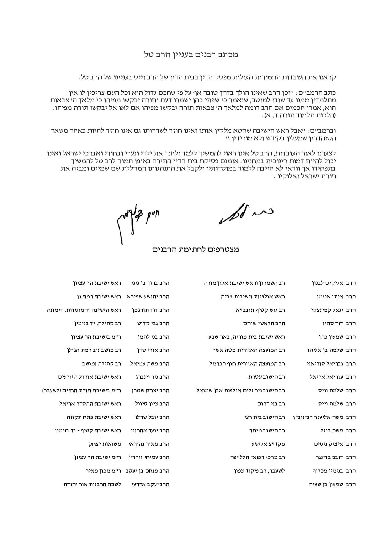 במכתב, נכתב, בין היתר: "קראנו את העובדות החמורות העולות מפסק הדין בבית הדין של הרב וייס בעניינו של הרב טל. כתב הרמב"ם: "וכן הרב שאינו הולך בדרך טובה אף על פי שחכם גדול הוא וכל העם צריכין לו אין מתלמדין ממנו עד שובו למוטב, שנאמר כי שפתי כהן ישמרו דעת ותורה יבקשו מפיהו כי מלאך ה' צבאות הוא, אמרו חכמים אם הרב דומה למלאך ה' צבאות תורה יבקשו מפיהו אם לאו אל יבקשו תורה מפיהו. וברמב"ם: "אבל ראש הישיבה שחטא מלקין אותו ואינו חוזר לשררותו גם אינו חוזר להיות כאחד משאר הסנהדרין שמעלין בקודש ולא מורידין".