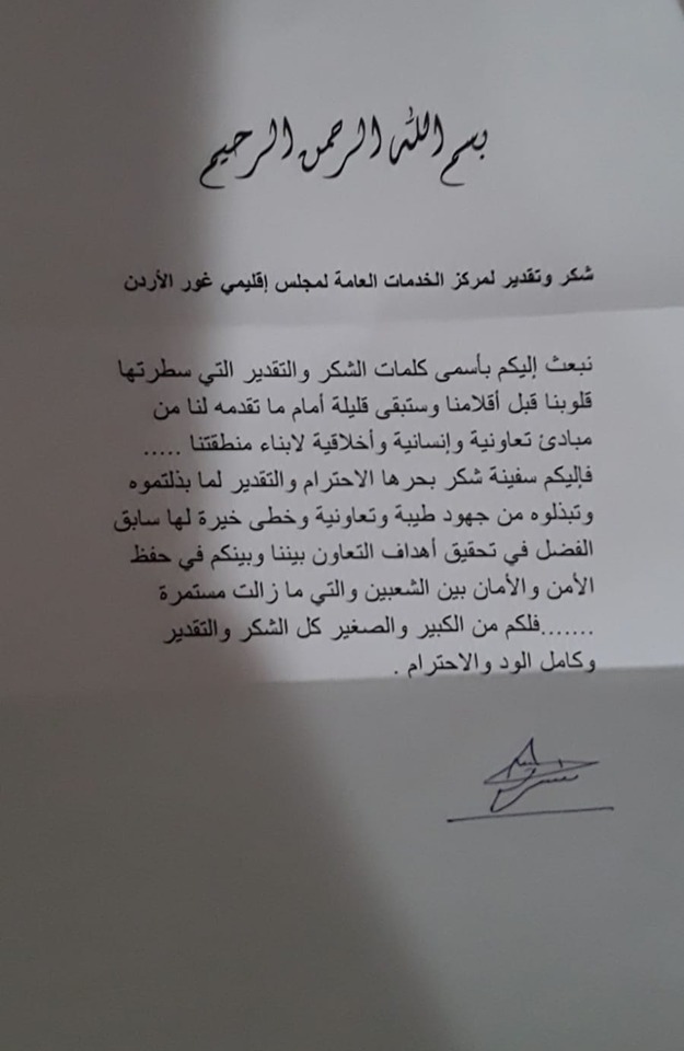 כעת קיבלה המועצה מכתב הוקרה מראש הג'יפטליק, והוא כותב כך (תרגום): "בשם אללה הרחום והרחמן. תודה והערכה למרכז לשירותים ציבוריים של המועצה האזורית בקעת הירדן. "אנו שולחים לכם את מילות התודה וההערכה הכי חמות שליבנו כבר חש עוד לפני שהעלינו אותן על הכתב, והמילים האלה הן מילים צנועות לנוכח היסודות של שיתוף הפעולה, ההומניטריות והמידות הטובות שהפגנתם כלפי בני האזור שלנו.