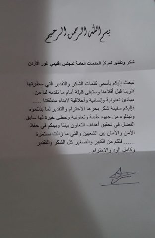 כעת קיבלה המועצה מכתב הוקרה מראש הג'יפטליק, והוא כותב כך (תרגום): "בשם אללה הרחום והרחמן. תודה והערכה למרכז לשירותים ציבוריים של המועצה האזורית בקעת הירדן. "אנו שולחים לכם את מילות התודה וההערכה הכי חמות שליבנו כבר חש עוד לפני שהעלינו אותן על הכתב, והמילים האלה הן מילים צנועות לנוכח היסודות של שיתוף הפעולה, ההומניטריות והמידות הטובות שהפגנתם כלפי בני האזור שלנו.