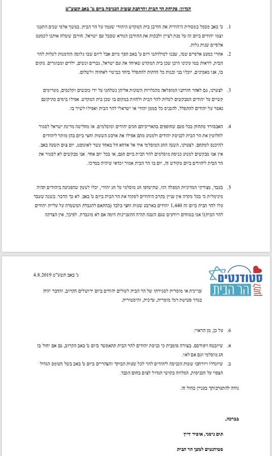 לצערנו, השנה החג המוסלמי איד אל אדחה חל באחד עשר לאוגוסט, יום צום תשעה באב. אין אנו מבקשים למנוע כניסת מוסלמים להר הבית היום חגם או בכל יום אחר, אנו מבקשים לא לסגור את הר הבית ליהודים ביום מקודש זה, יום בו הר הבית אמור וכדאי שיהיה במרכז".