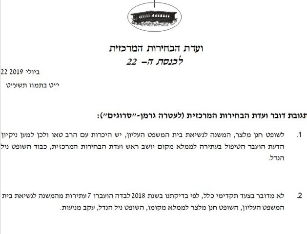 עוד נמסר בהודעת הוועדה כי "לא מדובר בצעד תקדימי כלל, לפי בדיקתנו בשנת 2018 לבדה הועברו 7 עתירות מהמשנה לנשיאת בית המשפט העליון, השופט חנן מלצר לממלא מקומו, השופט ניל הנדל, עקב מניעות".