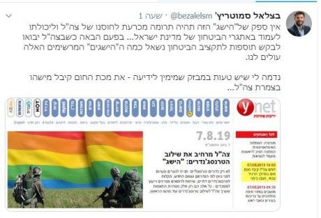 יו"ר האיחוד הלאומי השר בצלאל סמוטריץ' מגיב לפרסום לפיו צה"ל מעודד גיוס חיילים טרנסג'נדרים ורואה בכך הישג.