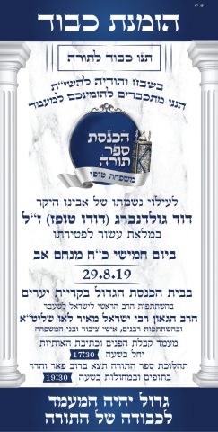 הציבור הרחב מוזמן להשתתף בהכנסת ספר התורה לעילוי נשמתו של דודו טופז שתערך ביום חמישי 29.8 בבית הכנסת הגדול בקריית יערים בשעה 17:30
