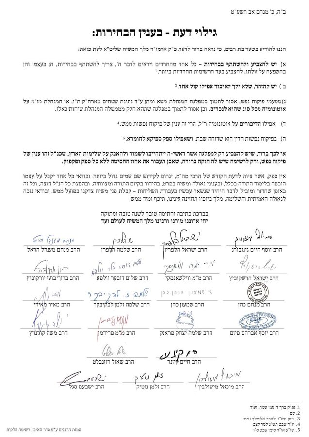 עוד הזהירו הרבנים במכתב כי יש להצביע רק למפלגה שראשיה מתחייבים לשמור על שלימות הארץ, כשלדבריהם "זהו עניין של פיקוח נפש. אסור לתמוך במפלגה המנהלת משא ומתן על דבר נתינת שטחים מארץ הקודש, או המנהלת משא ומתן על אוטונומיה מכל סוג שהוא לנכרים".