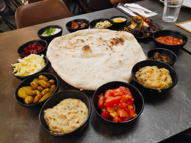 אנחנו ממליצים על הקאדה (36 ש"ח) בדרך כלל המנה מגיעה עם גבינה, אבל יהודית מילאה את הבצק בבשר לצד רוטב טחינה ועמבה. עם כל הסלטים מגיעות פיתות/לאפה טריות שיוצאות מהטאבון שנצמא במסעדה מיום היווסדה.