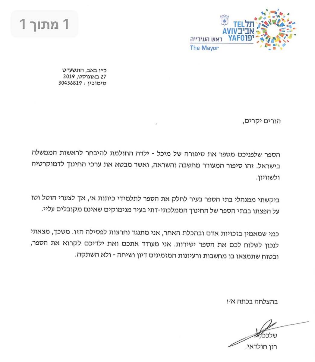 "שנית, אם חולדאי רוצה לחנך "להכרת האחר, לדיון ולשיחה, ולא להשתקה", אז כמו ששלח לתלמידים הדתיים ספר שמאתגר את השקפת עולמם, בטח שלח לתלמידים החילוניים ספר שיתאגר את השקפת העולם שלהם. זו לא צריכה להיות חוברת של הרב אלי סדן; יספיק ספר ילדים בשבח שמירת השבת, אולי אחד מהספרים הנפלאים של רבקה אליצור.