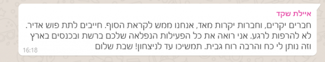 בהודעה לפעילים אמרה שקד לקראת השבוע וחצי האחרונים עד ליום הבוחר. "אנחנו ממש לקראת הסוף. חייבים לתת פוש אדיר. לא להרפות לרגע. אני רואה את כל הפעילות הנפלאה שלכם ברשת ובכנסים בארץ וזה נותן לי כח והרבה רוח גבית. תמשיכו עד לניצחון", כתבה להם לפני שבת.