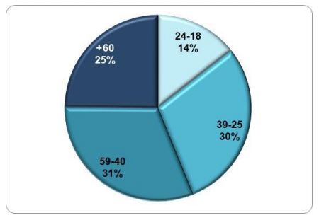 בפילוח לפי שכבות גיל עולה כי כ-14% מבעלי זכות הבחירה הם צעירים בני 24-18, 30% בני 39-25, ו-31% בני 59-40. חלקם של בעלי זכות בחירה בני 60 ומעלה, עומד על כ-25%.