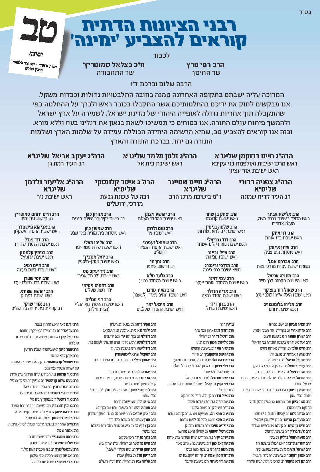 כ100 רבנים סרוגים הצטרפו למכתב התמיכה ברשימת ׳ימינה׳ ששלחו זקני רבני הציונות הדתית לפני כשבוע וחצי לרב רפי פרץ ולבצלאל סמוטריץ'.