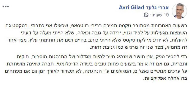 גלעד הבהיר כי מדובר בטקס שלא הוא כתב ואמר: "בשעות האחרונות מסתובב טקסט תמיכה בביבי בווטסאפ, שכאילו אני כתבתי. בטקסט גם השמצות מגעילות על לפיד וגנץ, ירידה על גובה וכאלה, שלא הייתי מעלה על דעתי להעלות. לא יודע מי לקח טקסט שלא הייתי כותב בחיים ושם את חתימתי עליו. מצד אחד זה מחמיא, מצד שני זה מרגיש כמו גניבת זהות".