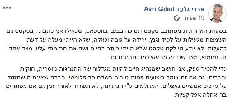 איש התקשורת אברי גלעד, מבהיר כי טקסט שרץ ביממה האחרונה ברשתות החברתיות בשמו, הוא זיוף ואינו נכתב על ידו. מדובר בהודעה בה, לכאורה, גלעד מביע את תמיכתו בבנימין נתניהו תוך שהוא משמיץ את בני גנץ ויאיר לפיד.