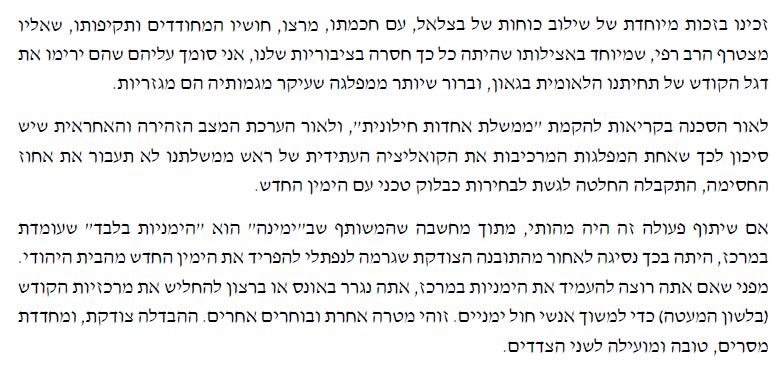 לאחר מכן מפרט הרב גנץ את מעלותיהם של בצלאל סמוטריץ' והרב רפי פרץ: "עם חכמתו, מרצו, חושיו המחודדים ותקיפותו, שאליו מצטרף הרב רפי, שמיוחד באצילותו שהיתה כל כך חסרה בציבוריות שלנו. אני סומך עליהם שהם ירימו את דגל הקודש של תחיתנו הלאומית בגאון, וברור שיותר ממפלגה שעיקר מגמותיה הם מגזריות."