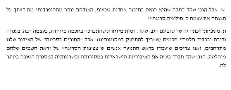 לשאלה, כיצד איילת שקד רואה את החיבור בין המפלגות כמהותי, משיב הרב גנץ שבחים על שקד: "משפחתי זכתה לקשר טוב עם הגב' שקד. דמות מיוחדת שהתברכה בחכמה מיוחדת, בעצמה רבה, בענווה נדירה ובכבוד תלמידי חכמים (שצריך להתחזק במקמותינו). עם זאת הרב מעדיף כי בראש המחנה יעמדו נבחרי ציבור ש"צפיפות הסריגה" של יראת השמיים שלהם מוחלטת.