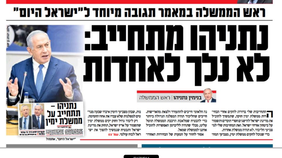 אנחנו כמובן לא שכחנו איך לפני חודש במאמר מיוחד שהופיע ככותרת הראשית של העיתון 'ישראל היום' התחייב נתניהו כי לא תהיה ממשלת אחדות.