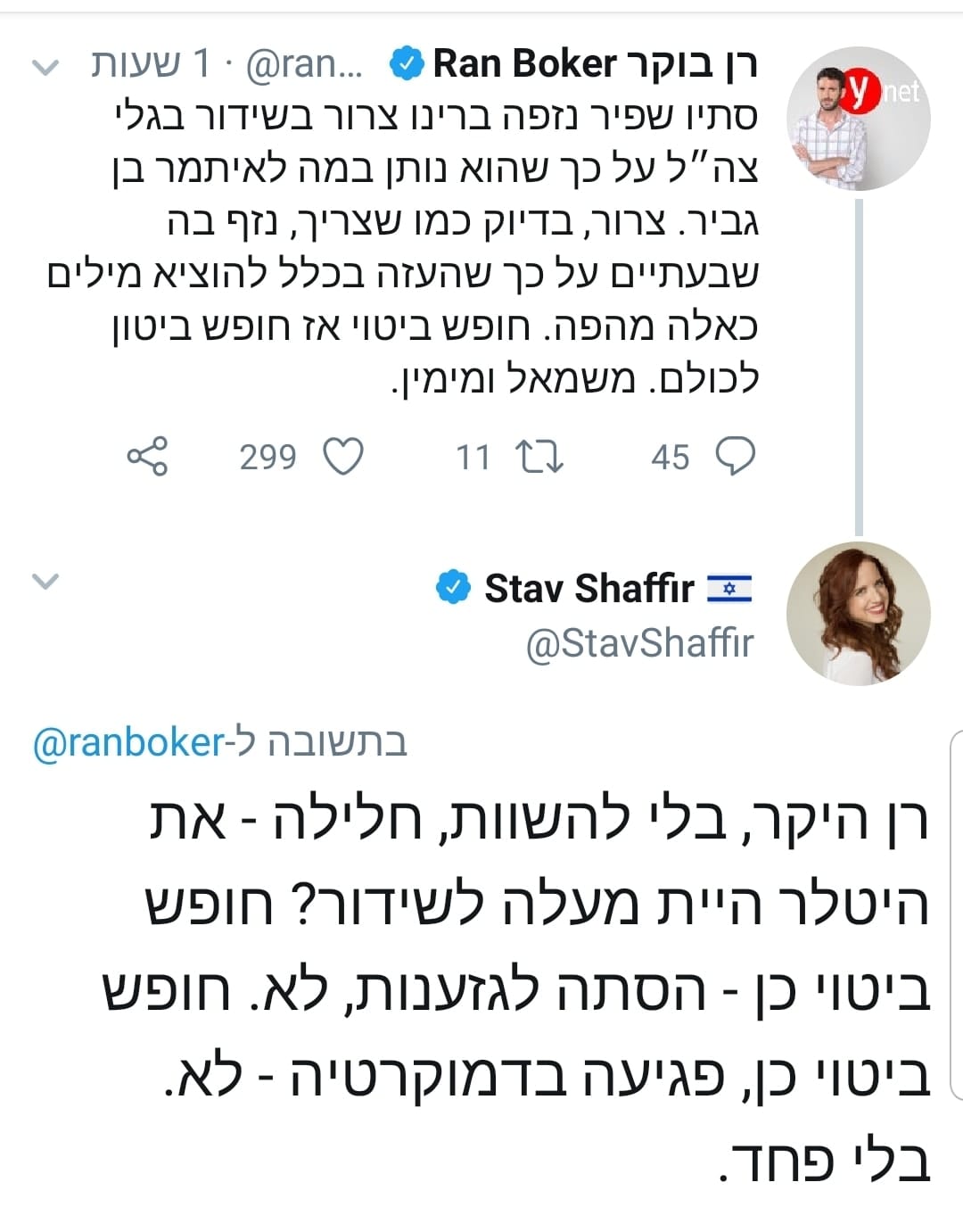 שפיר הגיבה לציוץ שהעלה כתב 'ווינט' רן בוקר, בו ציין כי רינו צרור נזף הבוקר בשידור בגלי צה"ל בשפיר, לאחר שזו נזפה בו קודם על שאפשר לעו"ד בן גביר להתראיין בשידור. שפיר צייצה בתגובה: "רן היקר, בלי להשוות, חלילה – את היטלר היית מעלה לשידור? חופש ביטוי כן – הסתה לגזענות, לא. חופש ביטוי כן, פגיעה בדמוקרטיה – לא. בלי פחד".