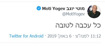 חבר הכנסת יוגב הראשון שצייץ בטוויטר "כל עכבה לטובה", היום פורסם בישראל היום כי בין שני חברי הכנסת שמייצגים את הבית היהודי: מוטי יוגב והרב רפי פרץ שורר קרע קשה של חוסר אמון ואי עבודה משותפת.