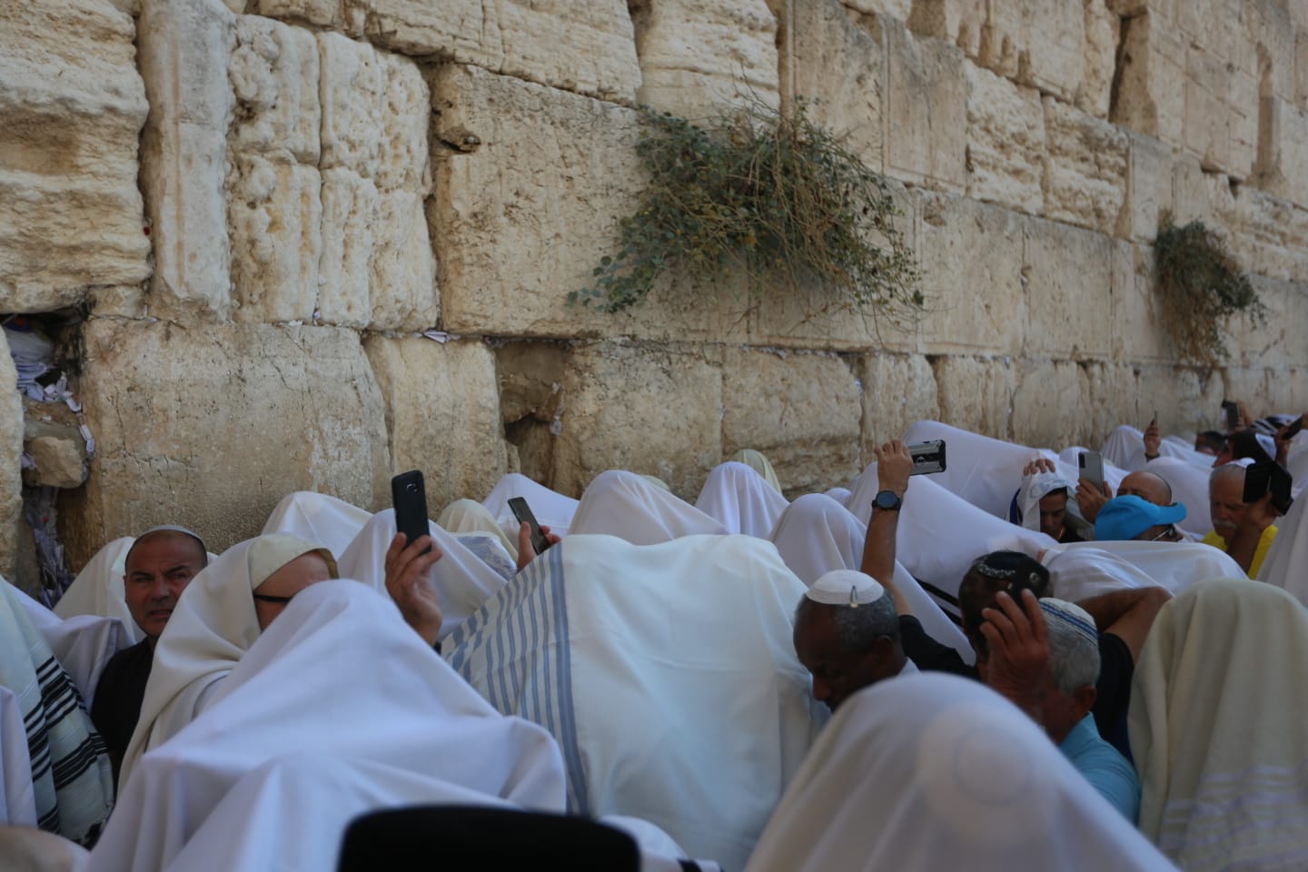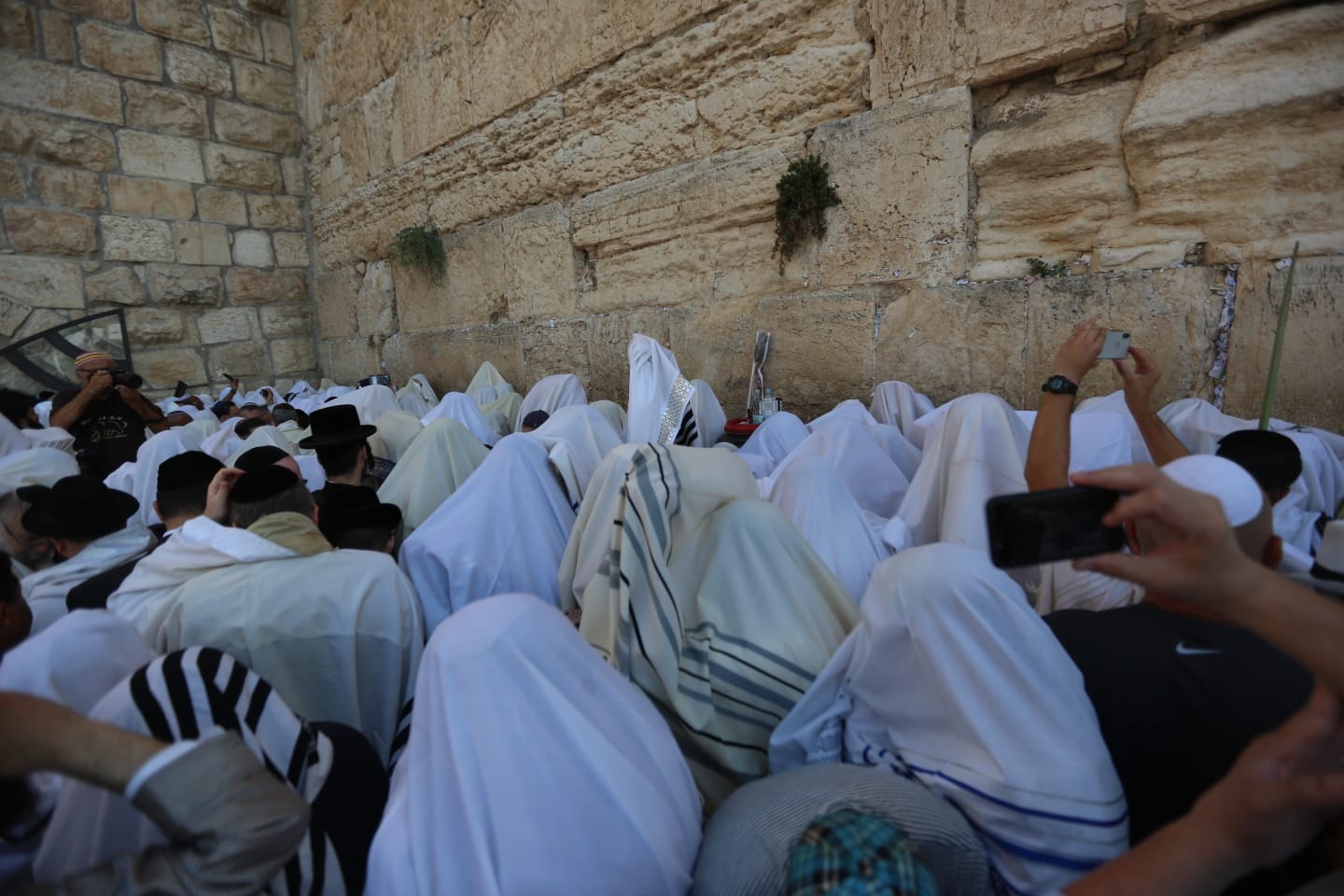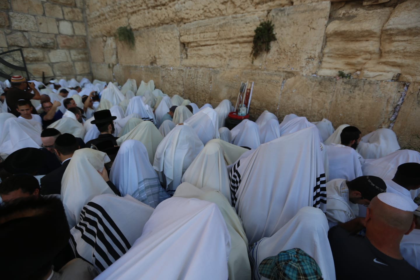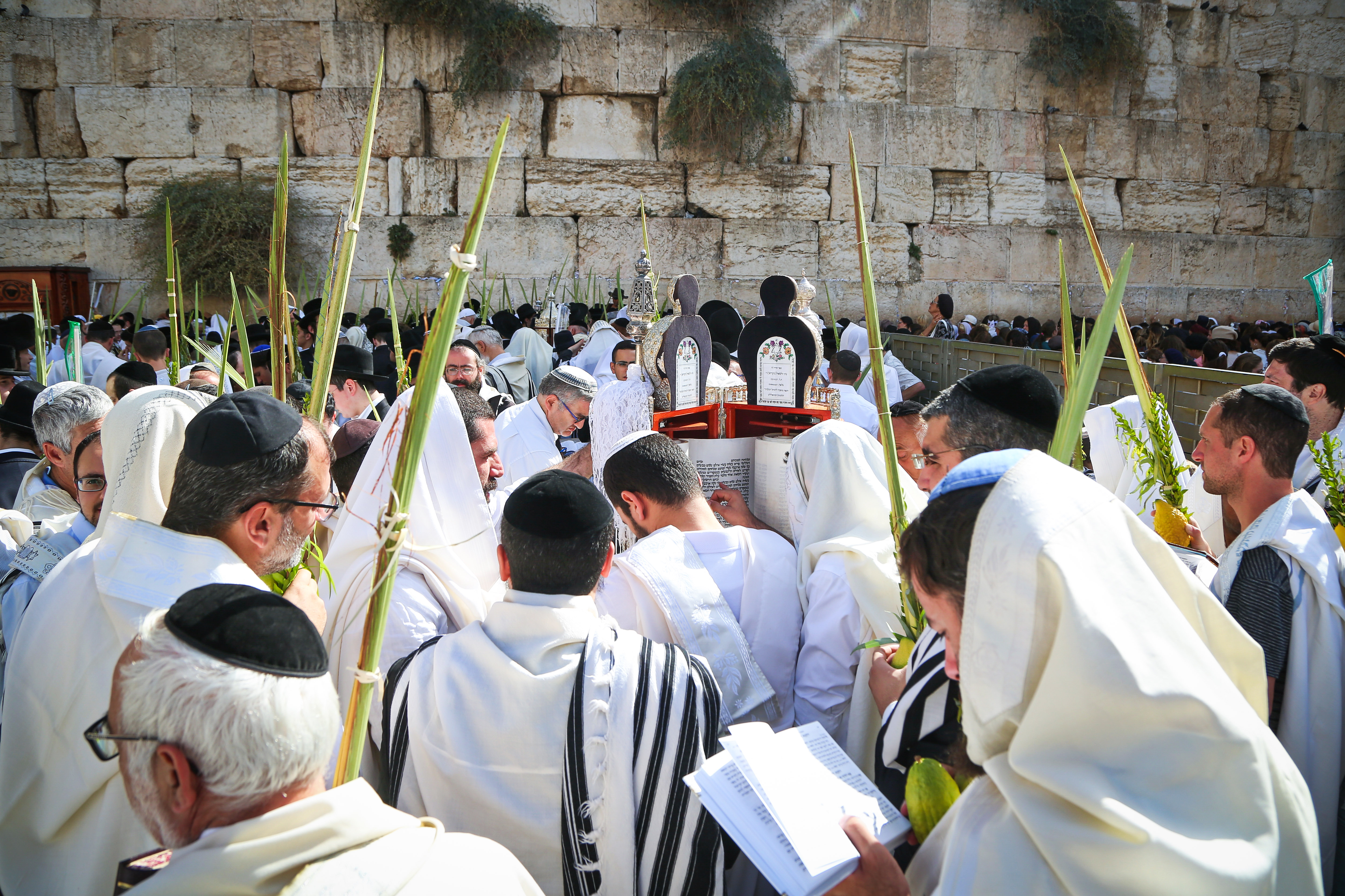 עטופים בטליתות וארבעת המינים בידיהם; צפו בגלריית הענק מהתפילה בכותל: