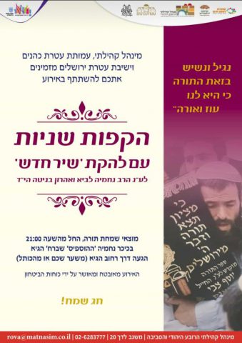 אירוע הקפות שניות מרכזי, יתקיים ביום שני 21.10.19, בשעה 20:30, בחצר בית הספר נעורים. הכניסה מרחוב הפלמ"ח על יד בית הכנסת "נחלת אבות".