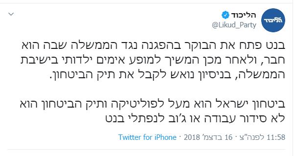 רק לפני 11 חודשים תקפו בליכוד את נפתלי בנט, שדרש את תיק הביטחון לאחר התפטרותו של ליברמן, במילים האלה: "בנט פתח את הבוקר בהפגנה נגד הממשלה שבה הוא חבר, ולאחר מכן המשיך למופע אימים ילדותי בישיבת הממשלה, בניסיון נואש לקבל את תיק הביטחון. ביטחון ישראל הוא מעל לפוליטיקה ותיק הביטחון הוא לא סידור עבודה או ג׳וב לנפתלי בנט".