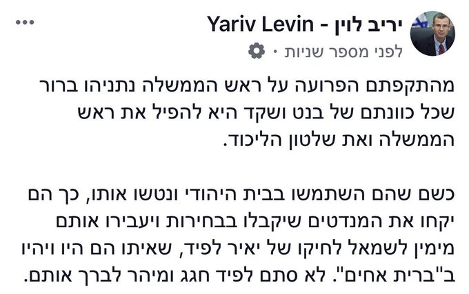 שבועיים לאחר מכן, עם הקמת הימין החדש היה השר יריב לוין, שהאשים את בנט ושקד כי "כל כוונתם היא להפיל את ראש הממשלה ואת שלטון הליכוד"