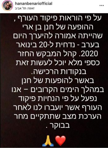 הזמר והיוצר חנן בן ארי שנמצא בשיאו של סבב מופעים מוצלח במיוחד בזאפה תל אביב, שכולו סולד אאוט. נאלץ להודיע על ביטול. המופע שהיה אמור להתקיים הערב, נדחה ל-20 בינואר 2020. יתר המופעים של חנן, הצפויים להתקיים במהלך הימים הקרובים תימסר הודעה לאחר הערכת המצב שתתקיים מחר בבוקר.