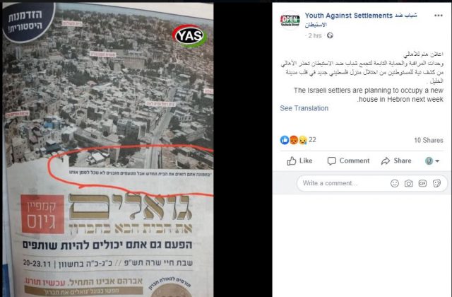 בעקבות המודעה בעלוני השבת, פרסמו בדף הפייסבוק של 'צעירים נגד ההתנחלויות' בערבית ובאנגלית: "המתנחלים הישראלים מתכננים לכבוש בית חדש בחברון בשבוע הבא".