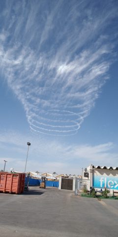 אין על מה לכתוב??? נפלתם מהירח כל ילד יודע שזה נוצר ממטוס ....ותמיד שיש עננות גבוהה יש מטוס של חיל האוויר שטס גבוה ויוצר בשמיים סילון רק שהפעם בצורת ספירלה...