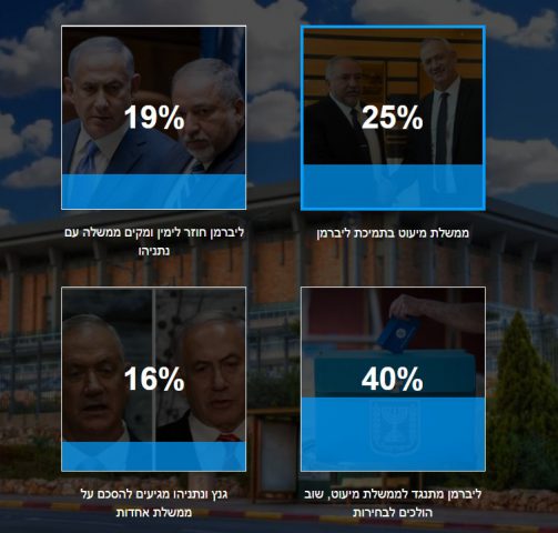 האפשרות שגנץ ונתניהו מרכיבים יחד ממשלת אחדות נתפסת בעיני הגולשים כאופציה הכי פחות סבירה: רק 16 אחוז מאמינים כי הצדדים יצליחו להתגבר על הפערים ב-23 הימים שנותרו עד לפיזור הכנסת. מנגד, 19 אחוז מהגולשים אמרו כי ליברמן יחזור לימין ויקים ממשלה צרה בראשות נתניהו – דבר שקיבל חיזוק משמעותי אתמול לאחר הפגישה של השניים, בעקבותיה נתניהו הורה שלא לתקוף את יו"ר ישראל ביתנו והתמקד במתקפה נגד כחול לבן ב"כנס החירום" של הליכוד.