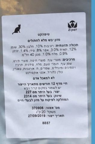 בבדיקה נרחבת עלו ממצאים המצביעים כי המזון היבש של חתולים בשם "טיפהקט" באריזה של 20 ק"ג, מכיל ריכוזים חריגים של ויטמין A ו-ויטמין D מלח וכן רמות גבוהות מאוד של נחושת, מתכת וסידן, דבר שעלול לסכן את בריאותם של בעלי החיים.