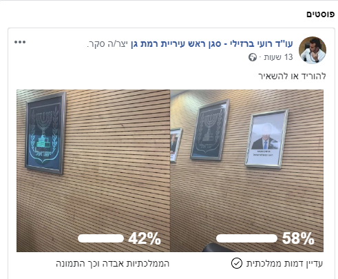 סגן ראש עיריית רמת גן פתח אתמול (ראשון) סקר לעוקביו בחשבון בפייסבוק אם להוריד או להשאיר את תמונתו של ראש הממשלה בנימין נתניהו ועורר סערה.