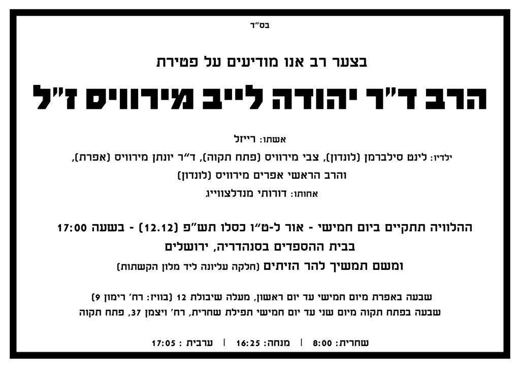 ברוך דיין האמת. הרב ד"ר יהודה מירוויס זצ"ל הלך לעולמו בשיבה טובה. הרב מירוויס התגורר בדרום אפריקה, ואחד מילדיו הוא הרב אפרים מירוויס רבה הראשי של אנגליה.