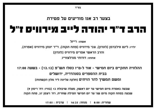 ברוך דיין האמת. הרב ד"ר יהודה מירוויס זצ"ל הלך לעולמו בשיבה טובה. הרב מירוויס התגורר בדרום אפריקה, ואחד מילדיו הוא הרב אפרים מירוויס רבה הראשי של אנגליה.