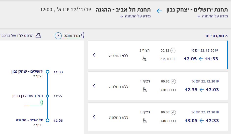 לפי לוח הזמנים – הנסיעה תארך 32 דקות. יש לשים לב ללוח הזמנים החדש של הרכבת בתחנת נבון, שיקדים או יאחר בכ-5 דקות את היציאה, לעומת זמני היציאה הנוכחיים שעמדו על כל חצי שעה עגולה.