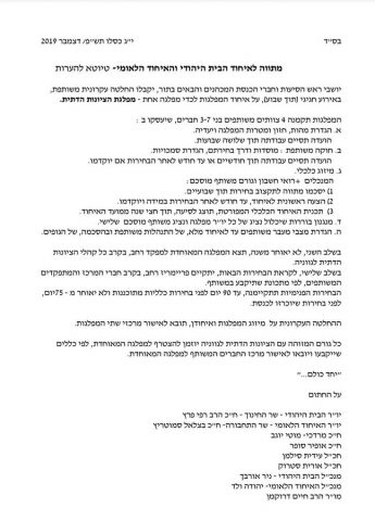 במסגרת המאבק בין מנכ"ל מפלגת הבית היהודי ניר אורבך לח"כ מהמפלגה מוטי יוגב, שולל הראשון את המתווה ושם המפלגה שמקדם יוגב: "ההסכם שיכלול גם את שם המפלגה, נגבש ביחד עם שותפינו באיחוד הלאומי ונצא לתקשורת ולציבור בהודעה מסודרת ומוסכמת", הוא מודיע.