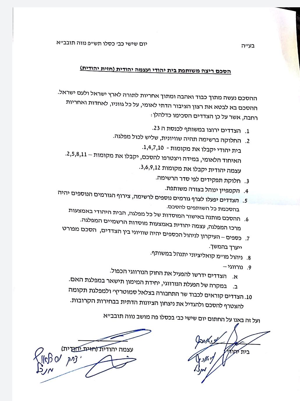 אמנם האיחוד הלאומי מחוץ להסכם, אך בבית היהודי ובעוצמה יהודית, השאירו להם מקומות, בחלוקה של מקום לבית היהודי, מקום לאיחוד הלאומי ומקום לעוצמה יהודית.