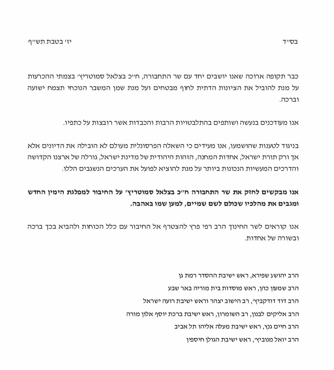 בתוך כך אותם הרבנים ועימם גם הרב אליקים לבנון רב מועצה אזורית שומרון וראש ישיבת אלון מורה והרב יואל מנוביץ' ראש ישיבת הגולן הוציאו היום הודעת תמיכה במהלך האיחוד שהוביל סמוטריץ' עם הימין החדש. "אנו מבקשים לחזק את שר התחבורה ח"כ בצלאל סמוטריץ' על החיבור למפלגת הימין החדש ומגבים את מהלכיו שכולם לשם שמיים, למען שמו באהבה"