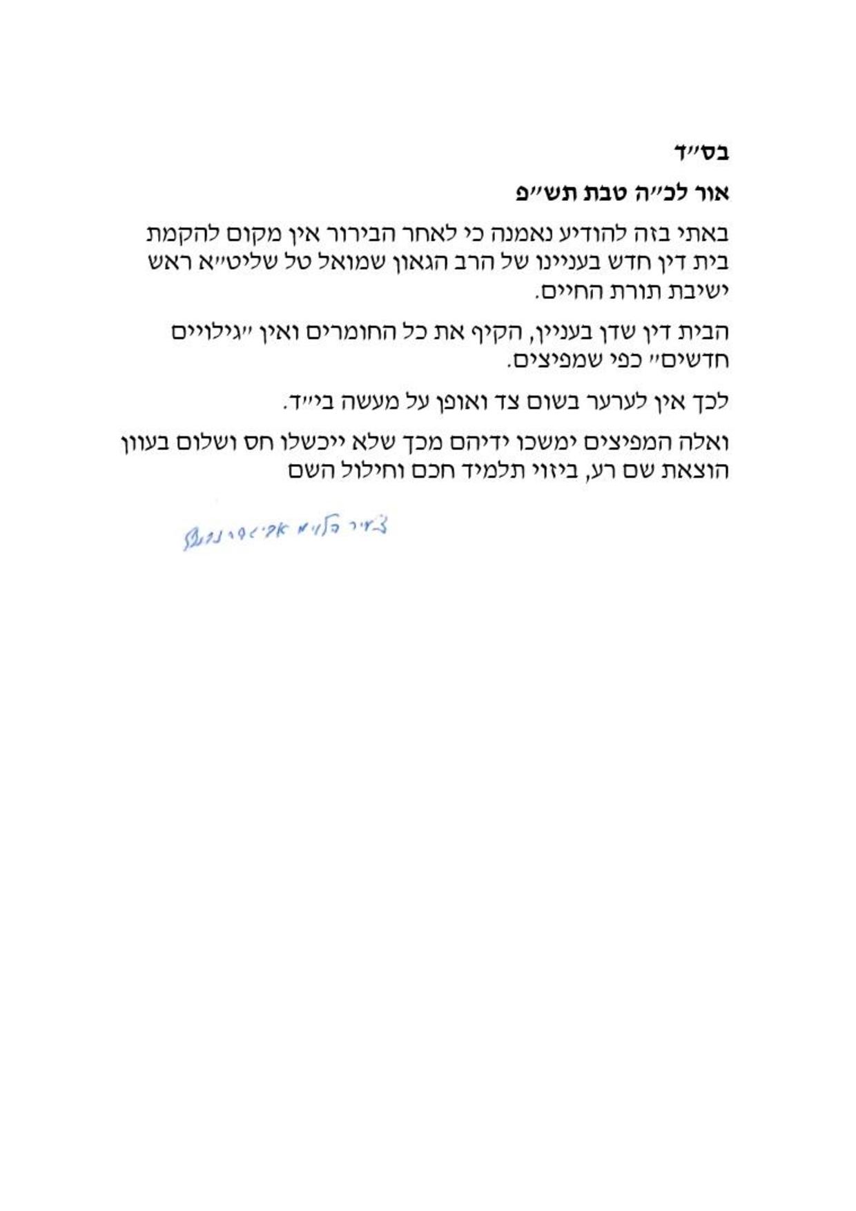 "באתי בזה להודיע נאמנה כי לאחר הבירור, אין מקום להקמת בית דין חדש בעניינו של הרב הגאון שמואל טל שליט"א, ואין "גילויים חדשים" כפי שמפיצים".
