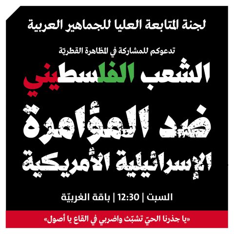ועדת המעקב העליונה של ערביי ישראל הודיע כי בשבת תתקיים הפגנה המרכזית של הציבור הערבי בשעה 12:300 בבאקה, נגד עסקת המאה. משמרות ומחאות בכל רחבי הארץ יתקיימו היום ומחר