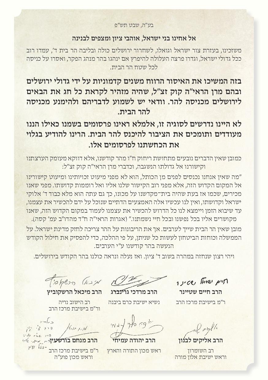 ולאחר מכן הם מבהירים: "ודאי יש לשמוע לדבריהם ולהימנע מכניסה להר הבית. לא היינו נדרשים לסוגיה זו, אלמלא ראינו פרסומים בשמנו כאילו הננו מעודדים ותומכים את הציבור להיכנס להר הבית. הרינו להודיע בגלוי את הכחשתנו לפרסומים אלו".
