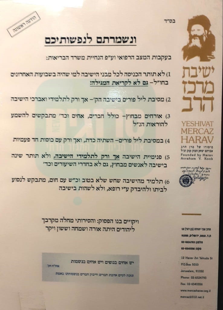 בהודעה שנתלתה בלוח המודעות של הישיבה נכתב כי בהנחיית משרד הבריאות לא תותר כניסה למתחם הישיבה למי ששהה בחו"ל בשבועיים האחרונים.