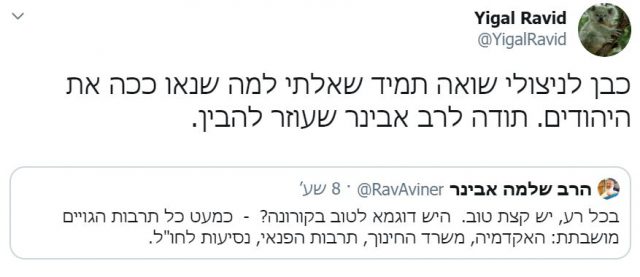 מעת לעת, מלבד המאמרים הרבים והפוסטים הארוכים בפייסבוק, מפרסם הרב אבינר בחשבון הטוויטר שלו ציוץ בן מספר מילים בענייני השעה. גם הבוקר (שלישי) פורסם ציוץ בחשבון שלו המתייחס למגיפת הקורונה.
