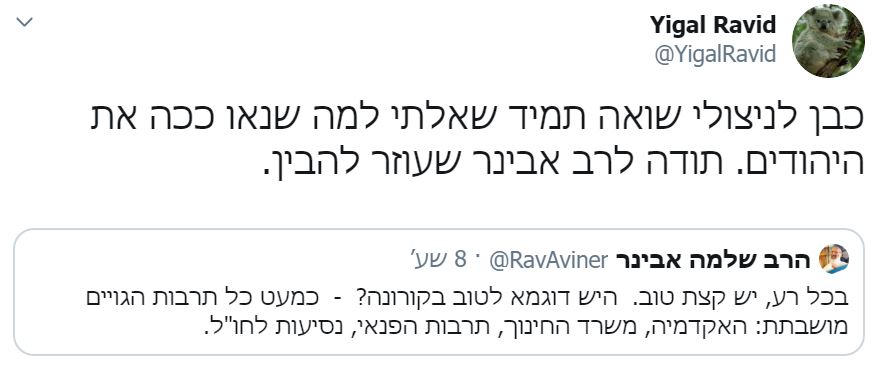 איש התקשורת ומגיש הטלויזיה יגאל רביד, צייץ מחדש את הדברים של הרב אבינר וכתב: "כבן לניצולי שואה תמיד שאלתי למה שנאו ככה את היהודים. תודה לרב אבינר שעוזר להבין".