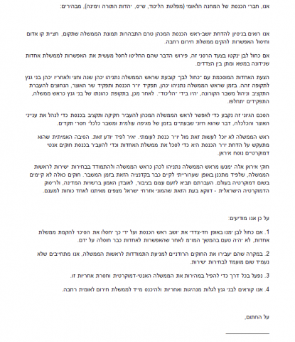 במכתב מכונה ההסכם "הגיוני", כי "זה נקבע כדי לאפשר לראש הממשלה המכהן להעביר חקיקה ותקציב בכנסת כדי לנהל את ענייני האוצר והכלכלה, דבר שהוא חיוני שבעתיים בזמן של מגיפה עולמית ומשבר כלכלי חסרי תקדים".