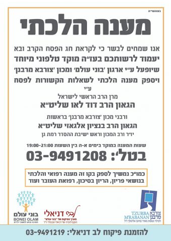 רגע לפני החג, ועם תחילת הנקיונות והארגונים – שמקבלים השנה מקשה נוספת בעקבות משבר הקורונה והגבלות משרד הבריאות – ארגון בוני עולם וצורבא מרבנן פותחים מוקד טלפוני מיוחד לקבלת מענה לשאלות הלכתיות הקשורות לנושא פסח.