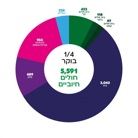 סה"כ מאושפזים: ביה"ח 637 בבית 3,062 במלון 689 טרם הוחלט מסגרת האשפוז 956. 226 החלימו ושוחררו.