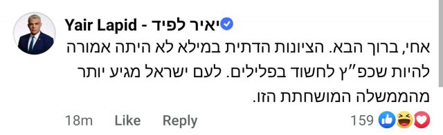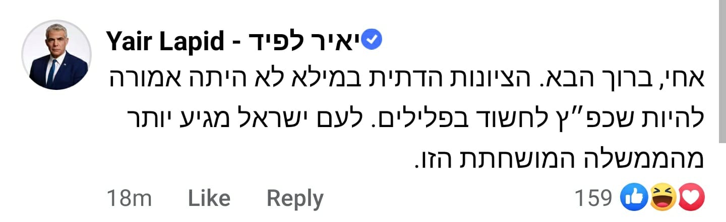 "אחי, ברוך הבא", כתב לפיד לבנט, והוסיף כי "הציונות הדתית במילא לא הייתה אמורה להיות שכפ"ץ לחשוד בפלילים. לעם ישראל מגיע יותר מהממשלה המושחתת הזו".